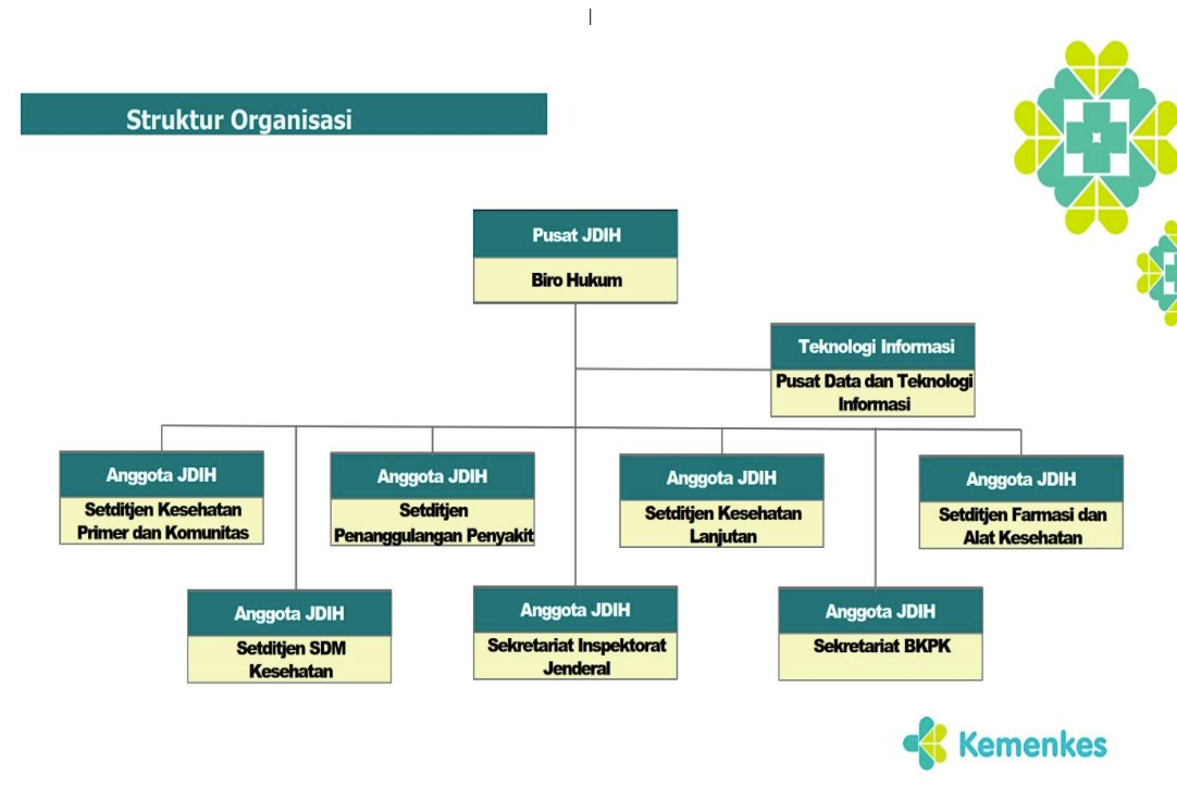 Bahwa untuk memberikan pemenuhan masyarakat atas dokumen dan informasi hukum sebagai bagian dari upaya mencerdaskan kehidupan bangsa dan menciptakan penyelenggaraan ketatapemerintahan yang baik, perlu dilakukan melalui pelayanan dari jaringan dokumentasi dan informasi hukum. Dan untuk melaksanakan ketentuan Pasal 5 ayat (1) Peraturan Presiden Nomor 33 Tahun 2012 tentang Jaringan Dokumentasi dan Informasi Hukum Nasional, perlu membentuk organisasi jaringan dokumentasi dan informasi hukum di lingkungan Kementerian Kesehatan. Untuk itu maka telah ditetapkan Peraturan Menteri Kesehatan Nomor 10 Tahun 2024 tentang Jaringan Dokumentasi dan Informasi Hukum di Lingkungan Kementerian Kesehatan, yang dimana organisasi JDIH Kementerian Kesehatan terdiri atas: Pusat JDIH dan Anggota JDIH. Pusat JDIH Kementerian Kesehatan dilaksanakan oleh Biro Hukum Sekretariat Jenderal dan Anggota JDIH Kementerian Kesehatan dilaksanakan oleh masing-masing unit utama diantaranya Sekretariat Direktorat Jenderal Kesehatan Primer dan Komunitas, Sekretariat Direktorat Jenderal Penanggulangan Penyakit, Sekretariat Direktorat Jenderal Kesehatan Lanjutan, Sekretariat Direktorat Jenderal Farmasi dan Alat Kesehatan, Sekretariat Direktorat Jenderal Sumber Daya Manusia Kesehatan, Sekretariat Inspektorat Jenderal dan Sekretariat BKPK. Sedangkan dari sisi teknologi informasi dilaksanakan oleh Pusat Data dan Teknologi Informasi.